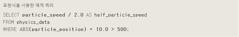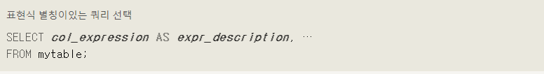 식을 사용하면 시간을 절약하고 결과 데이터의 추가 사후 처리를 줄일 수 있지만 쿼리를 읽기 어렵게 만들 수도 있으므로 SELECT식을 사용할 때 AS를 사용해 열 이름을 새로 지정한다.