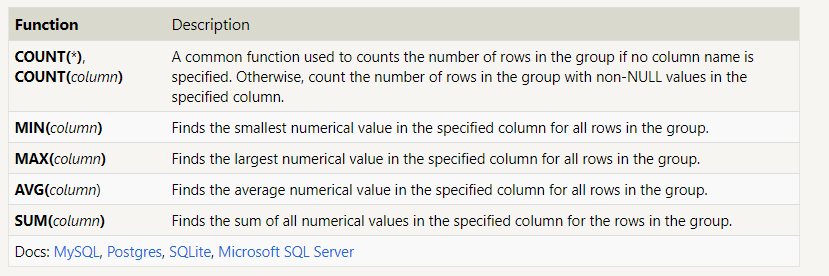 SELECT AGG_FUNC(column_or_expression) AS aggregate_description, …